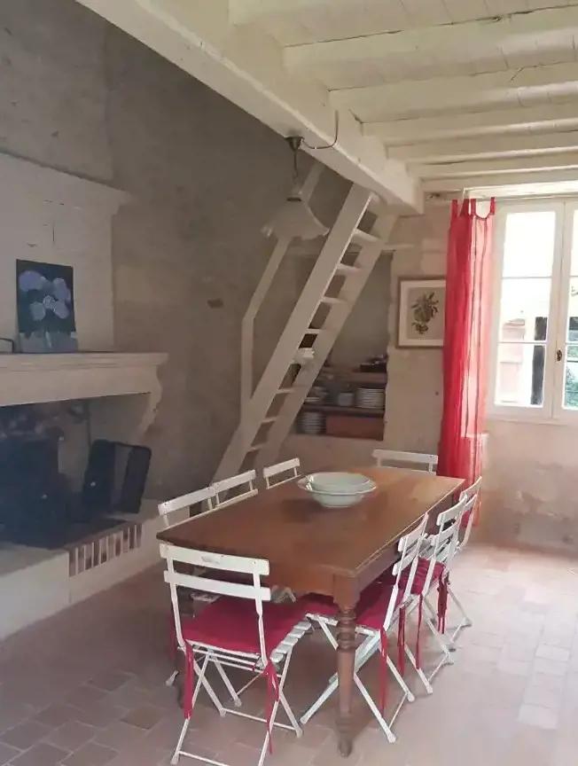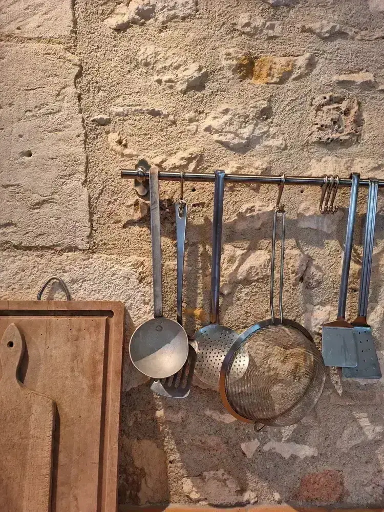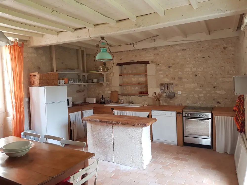 La cuisine partage le même espace de 32m² avec la salle à manger. Dominée par une cheminée et pierre, surplombée par la mezzanine, elle est entièrement équipée : four, lave-vaisselle, frigo-congélateur, bouilloire et machine à café etc. Une vaisselle aux couleurs douces répond aux pierres de moellon des murs et au spectaculaire volume.